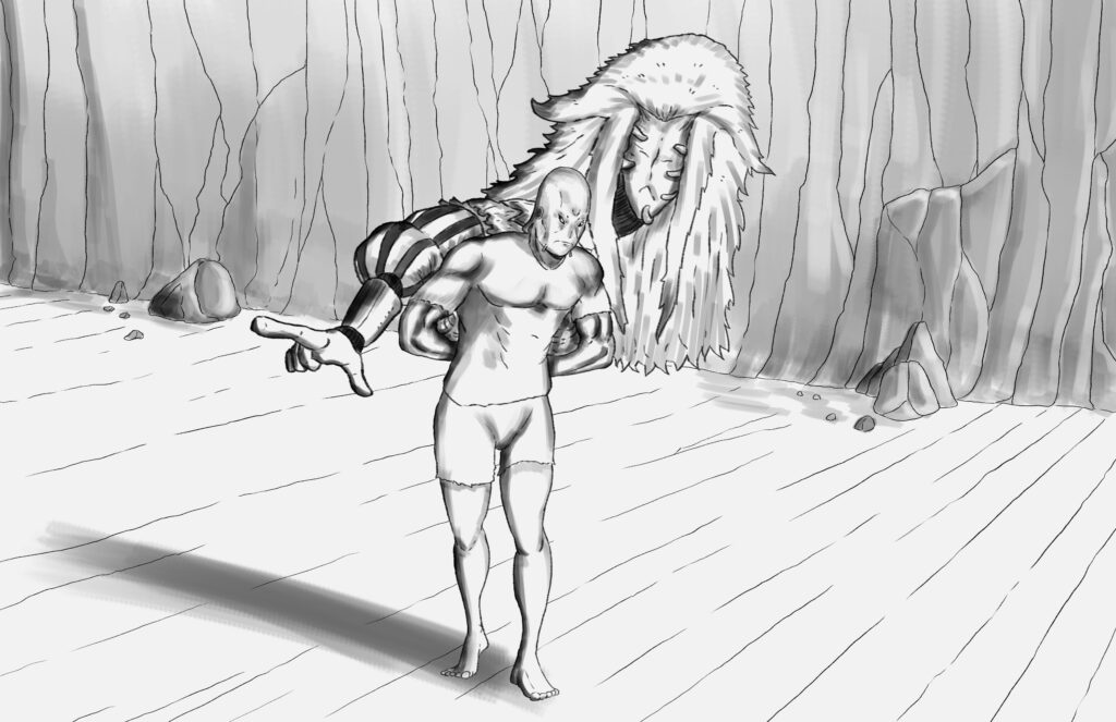 In both hands he holds the creature’s claws. The jagged edges of the claws tear at his flesh.