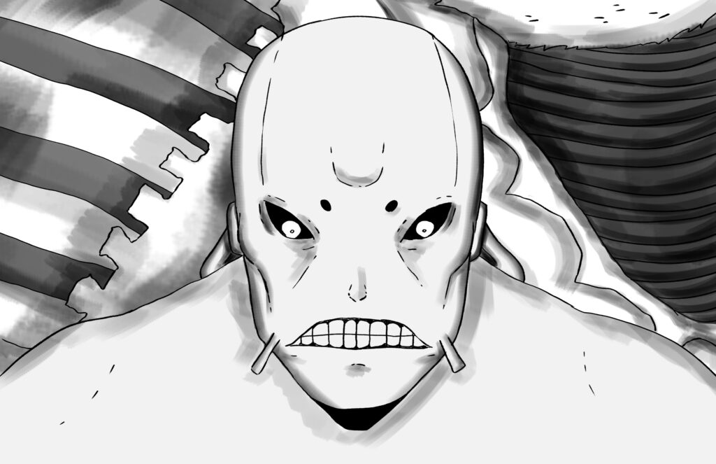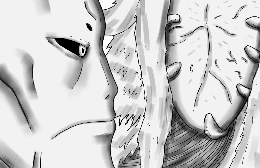 The Mountain Monarch’s face reveals itself from the darkness as he looks at Stride.