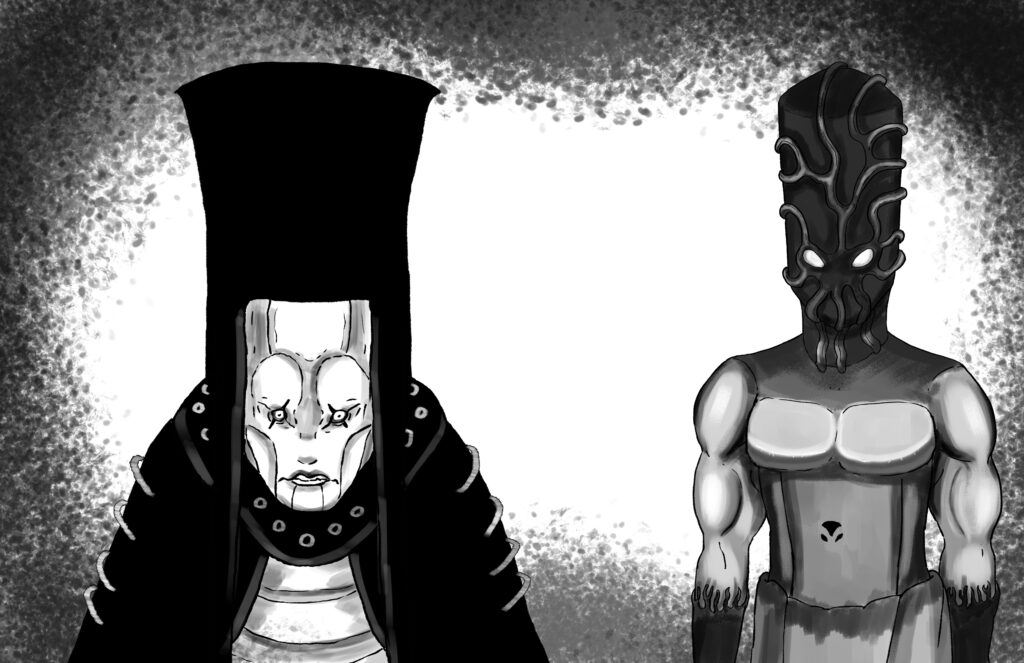 Two beings make their appearance. The one in front, a frail and brittle figure, clasping its hands together, is dressed in a long robe with a large crest in the middle. Despite its frailty one can sense it is fully aware of its own importance.