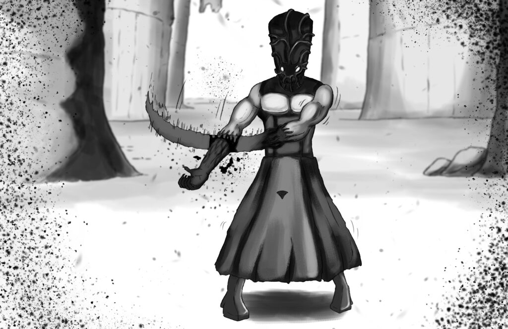 This noble being is followed by a soldier the likes of whom Stride has seen before. Stride hid from them in the woods when he was still a human. The soldier is clad in dark armour with a high helmet. He is wearing the same gauntlets as the creatures in the logging camp, gauntlets that are able to transform in any weapon he desires.