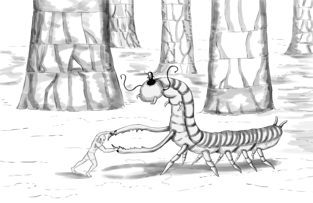 Shortly after, a massive centipede comes storming out of the pillar like tower behind them.