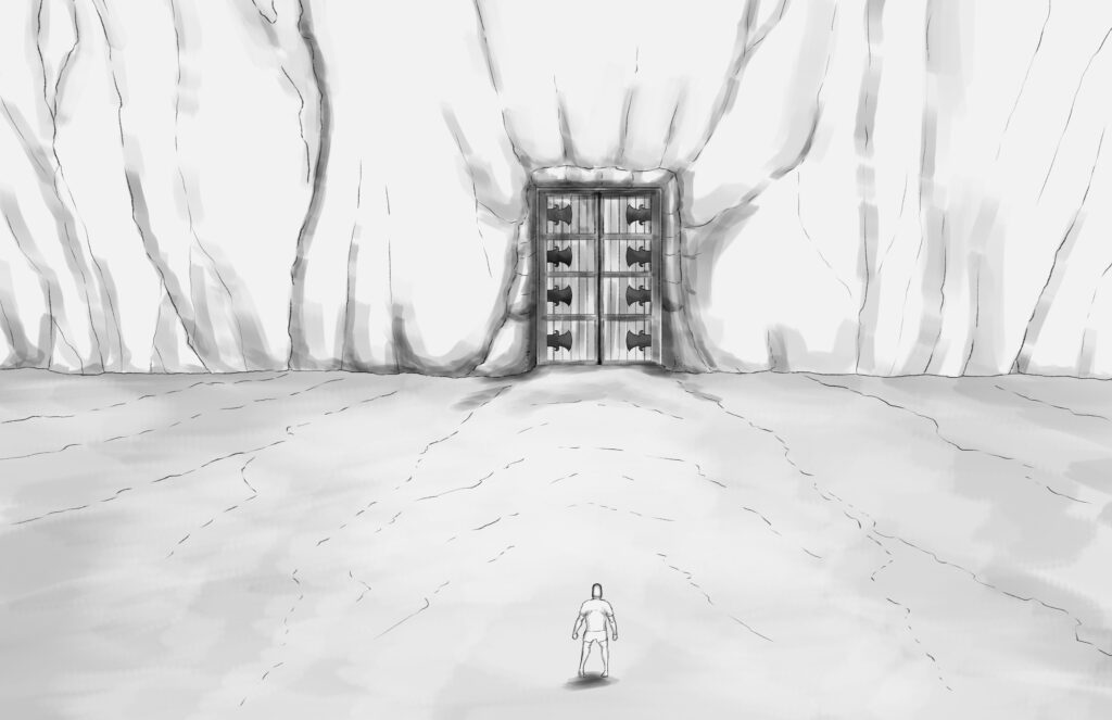 Stride stands confidently in front of the massive gate. Yet the longer he waits, the more uneasy he becomes. Stride’s confident posture lowers as his hands begin to shake.