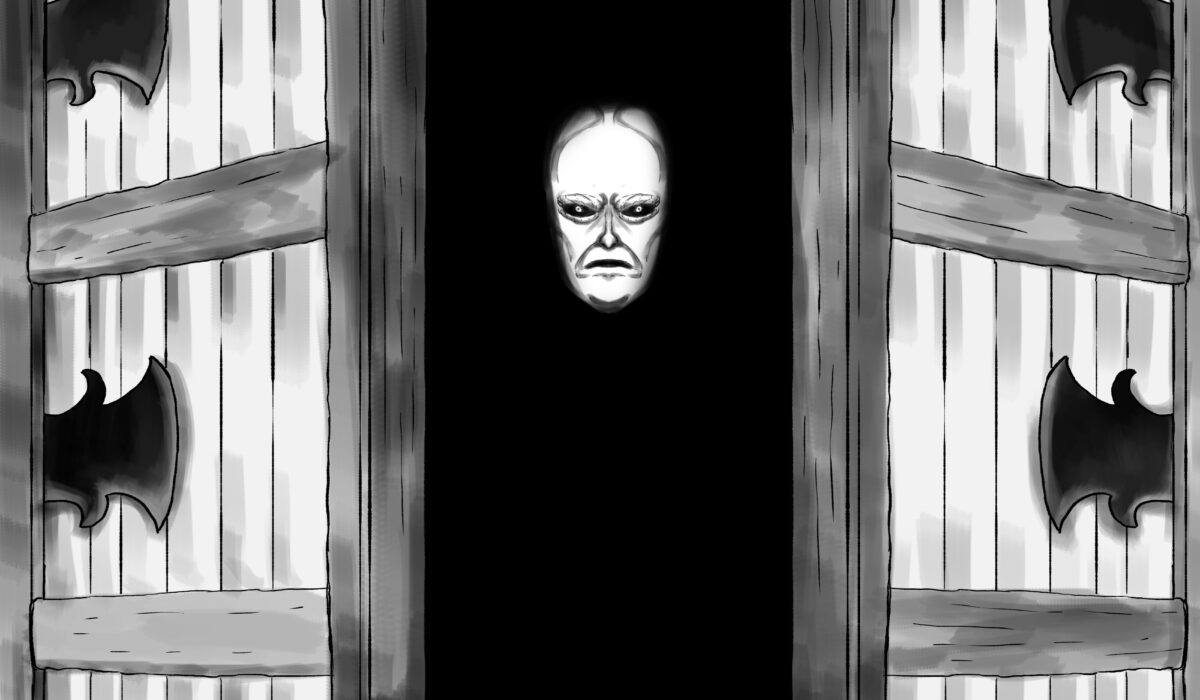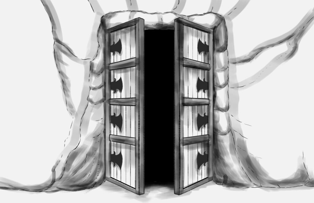 The doors creak open creating a loud roar akin to the rumbling of a storm. The gates of hell slither across the ground, crackling the earth beneath it. The open doors reveal only darkness.