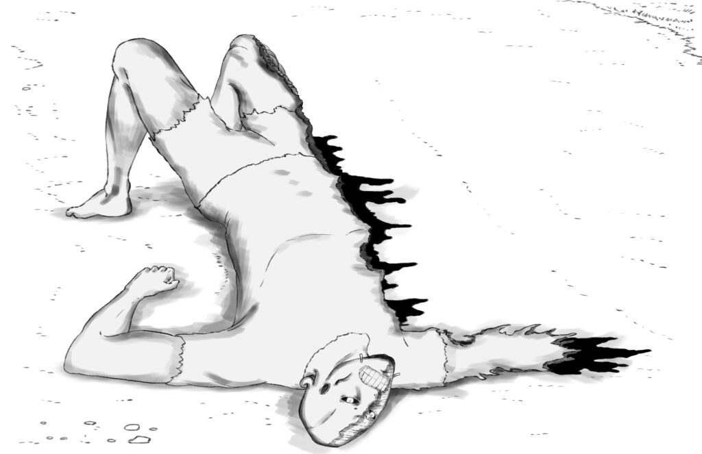 His body burns with pain. Yet the anger in his heart forces him to stand up and fight. He struggles to get back on his feet, wobbling like a newly born fawn on his regrown legs.
