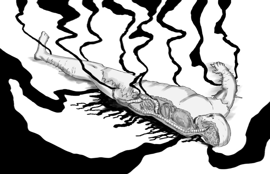 Blood leaks from his body, seeping deep into the ground.