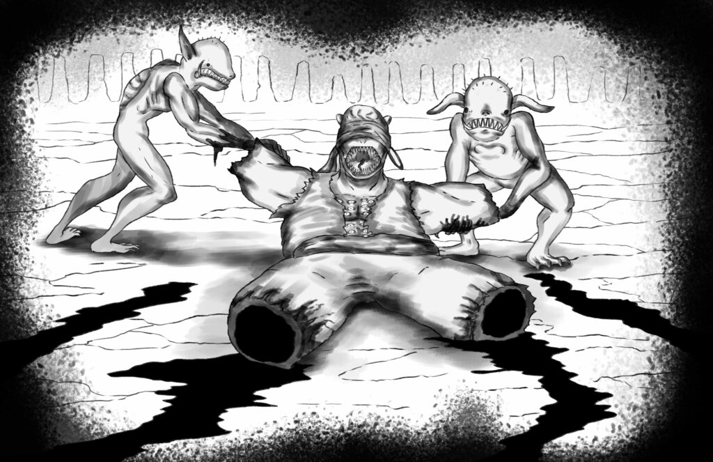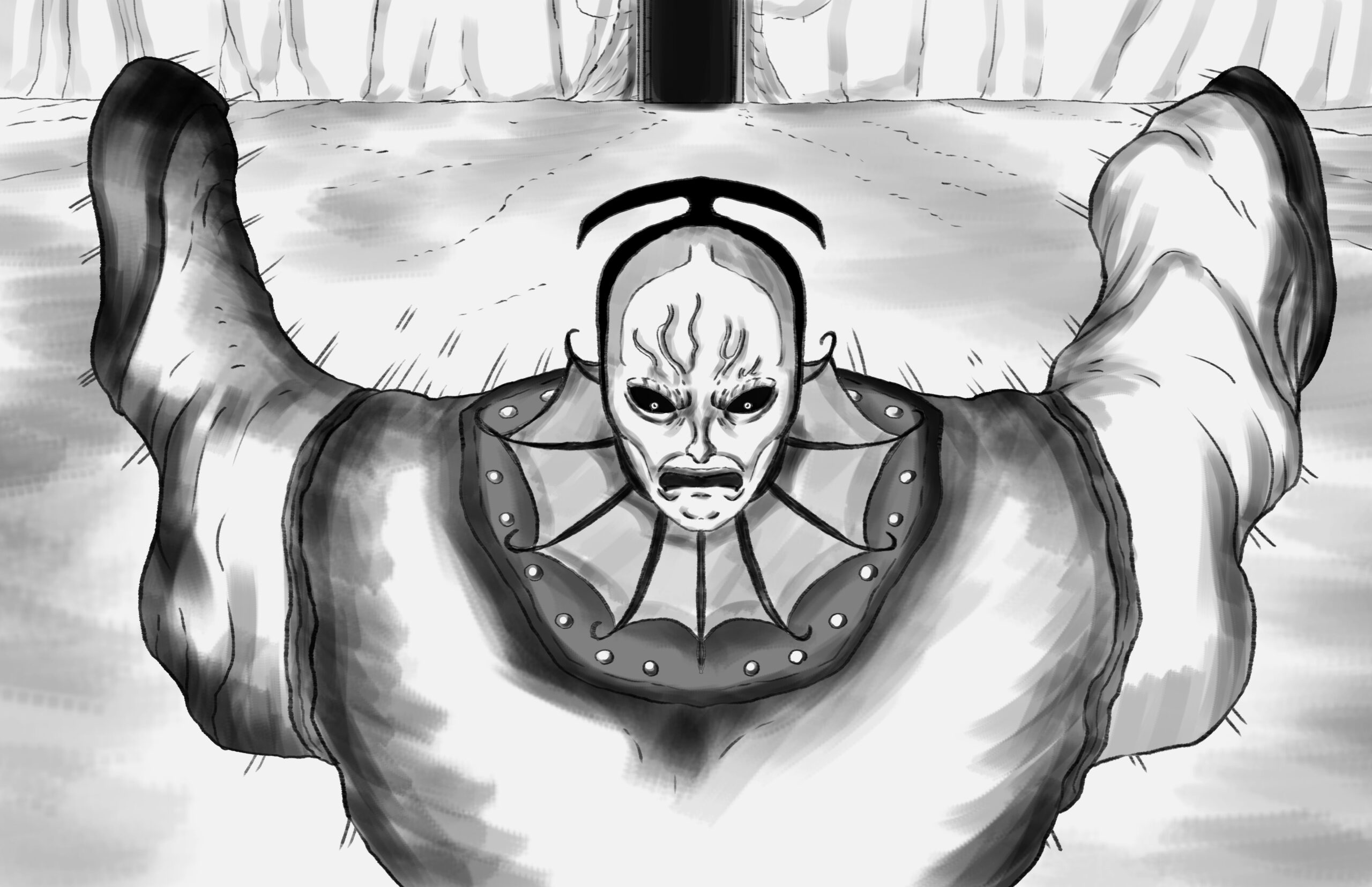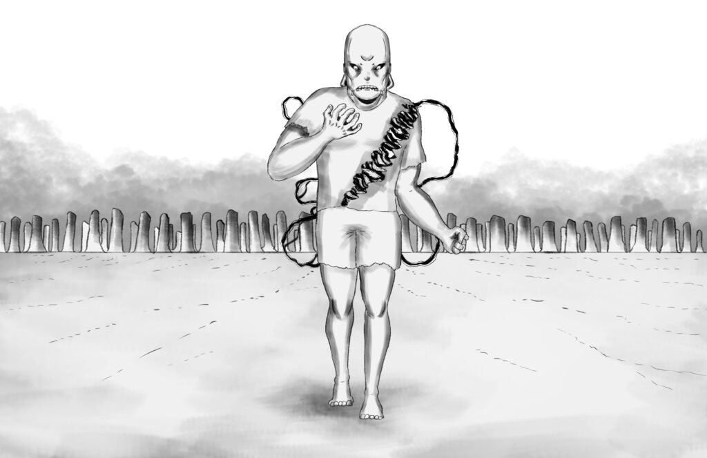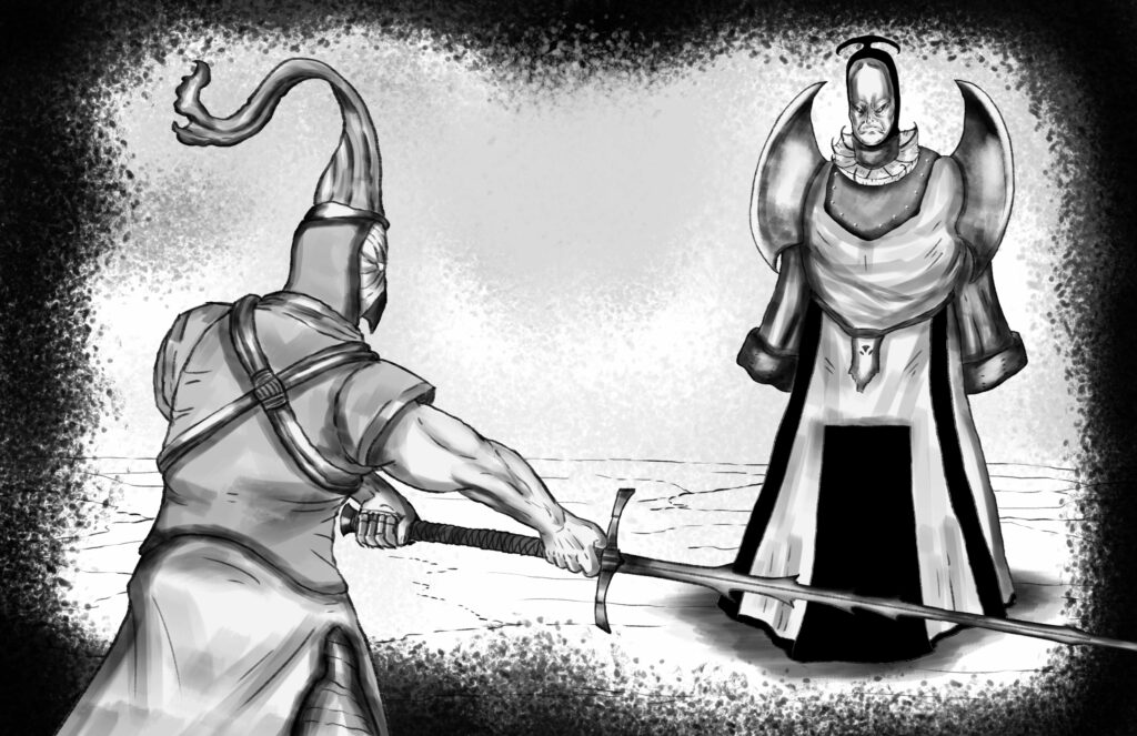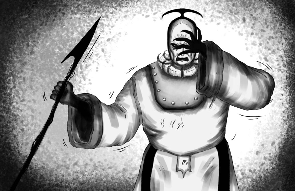 The blood-clotted spears pierce through The Monarch’s robe. Yet the Monarch makes no sound.