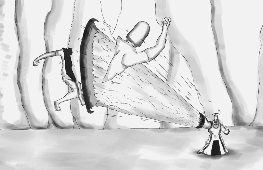 The Monarch raises his left arm, and points at Stride. The axe head on the Monarch’s left shoulder blitzes forward, like an arrow fired by a ballista. Stride’s feet stand nailed to the ground.