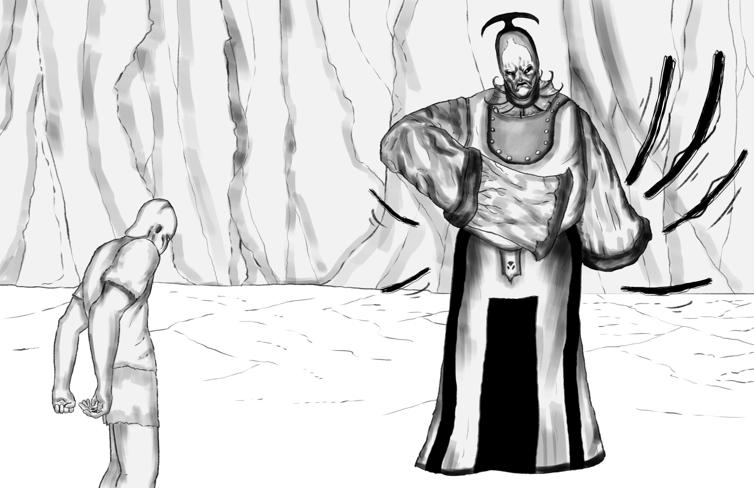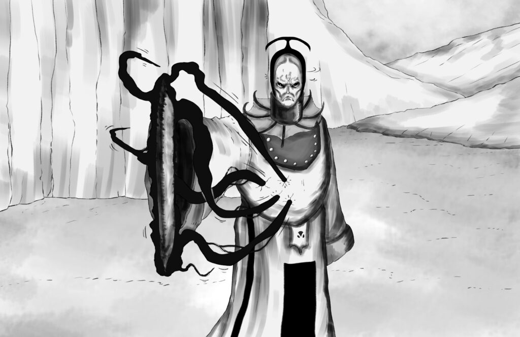 The two stare at each other. Not a word is exchanged, yet Stride knows with every fibre of his being that an audience with the Monarch is not meant as simple conversation. The bloodlust of The Monarch is palpable.