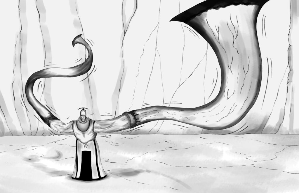 “You are unworthy of my presence!” He screams as he sweeps out his enormous blades. The blades appear to change in length as they fling through the air.