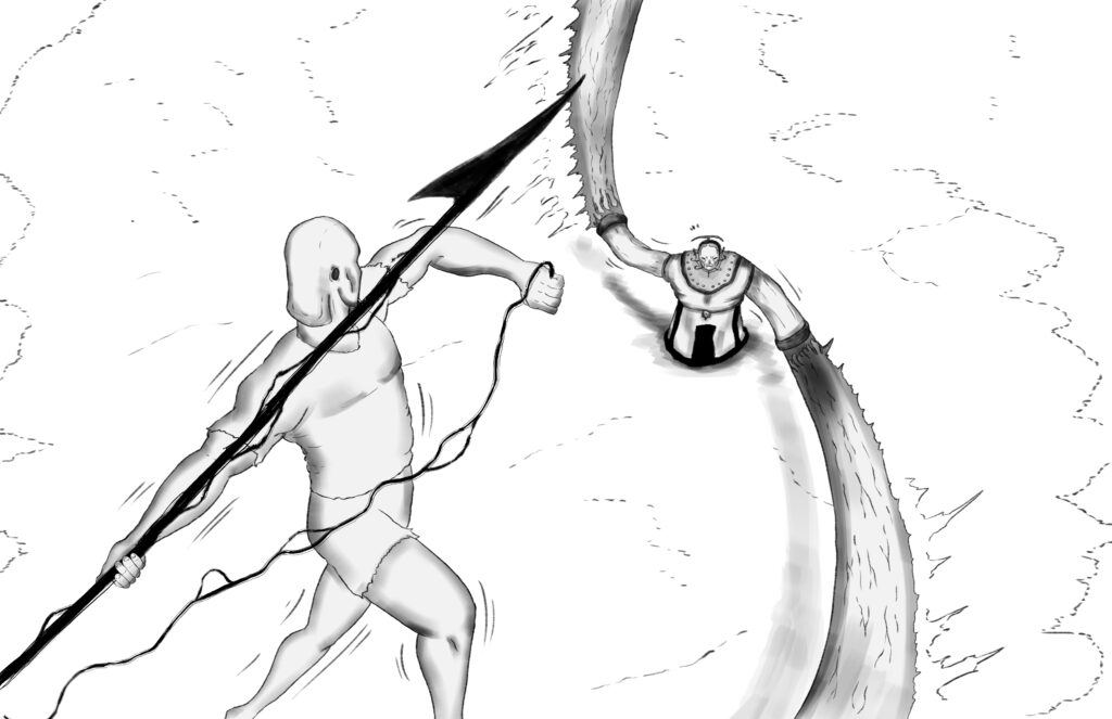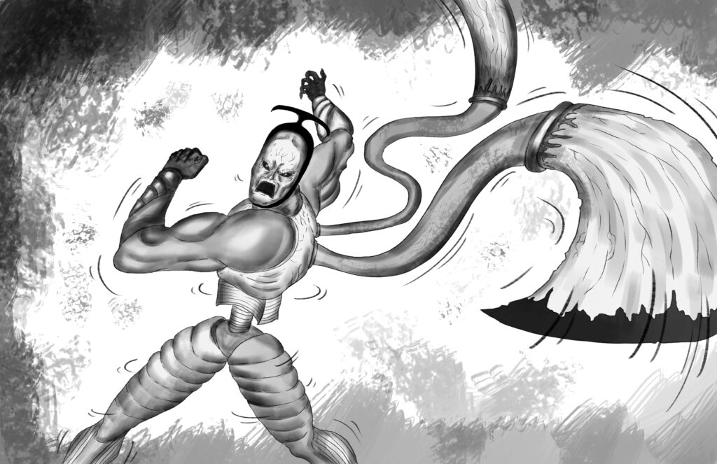 Stride leaps over the Monarch’s blade and at the peak height of his jump, he throws the harpoon at the Monarch with all his might.