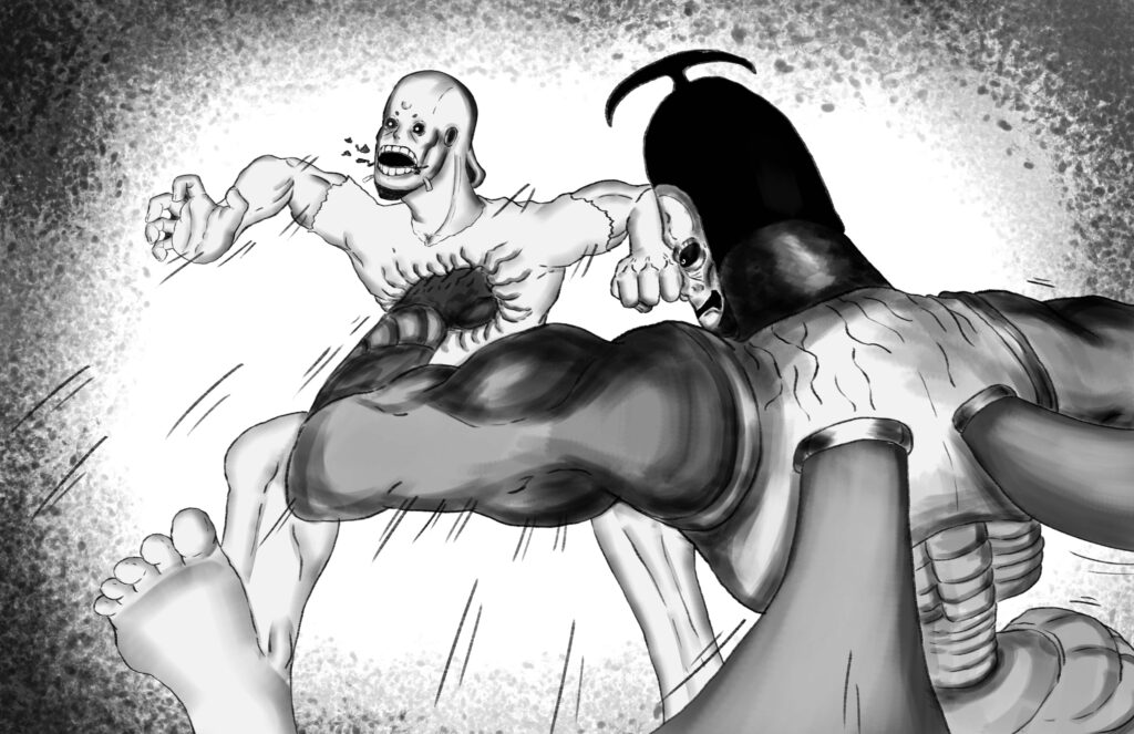 The Monarch’s ruthlessness is unwavering. No matter how much Stride’s body regenerates, The Monarch barrages him with his brutish fists.