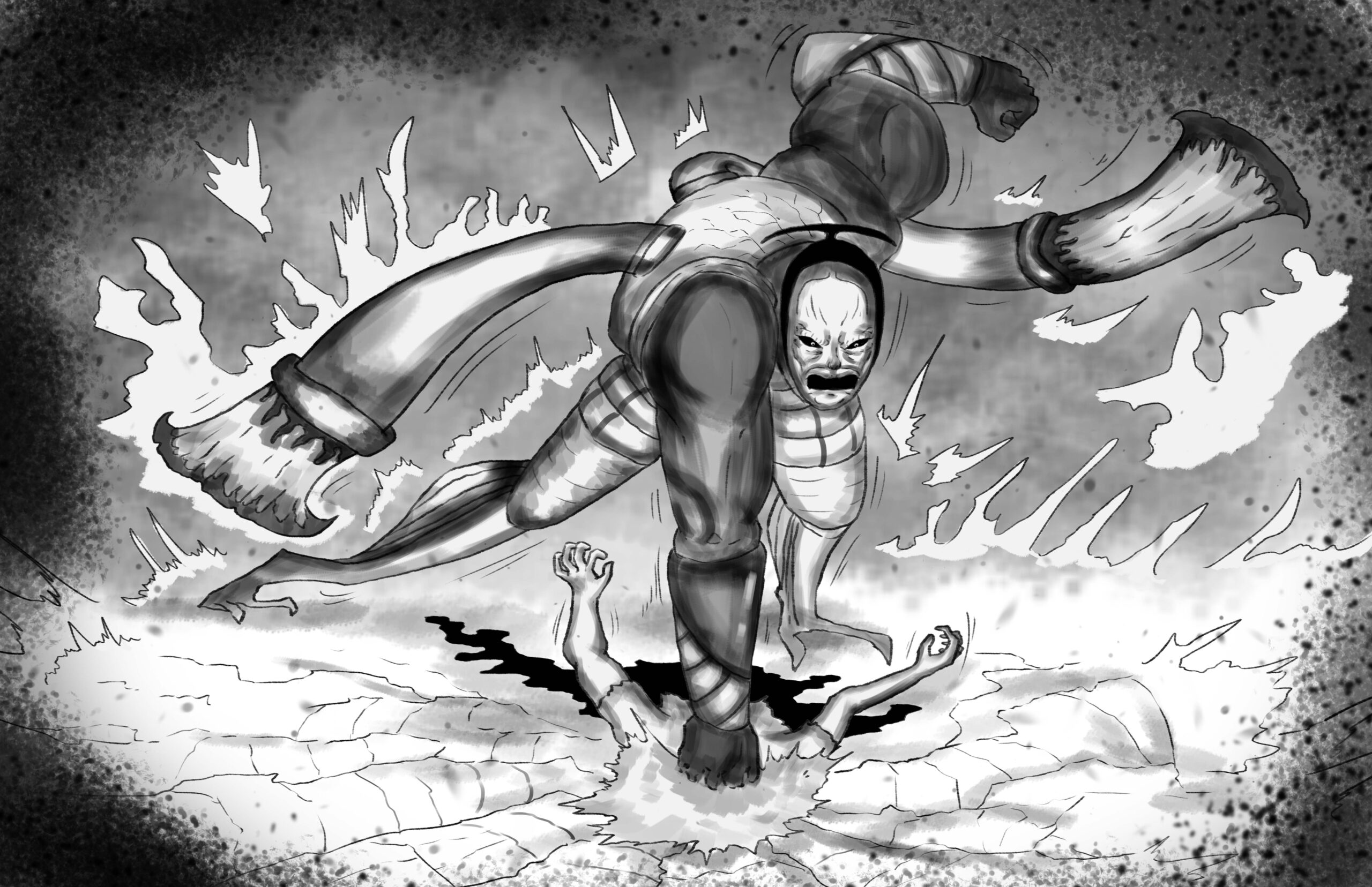 The Monarch smashes Stride headfirst into the ground, pouncing on his body as he cracks the earth underneath.