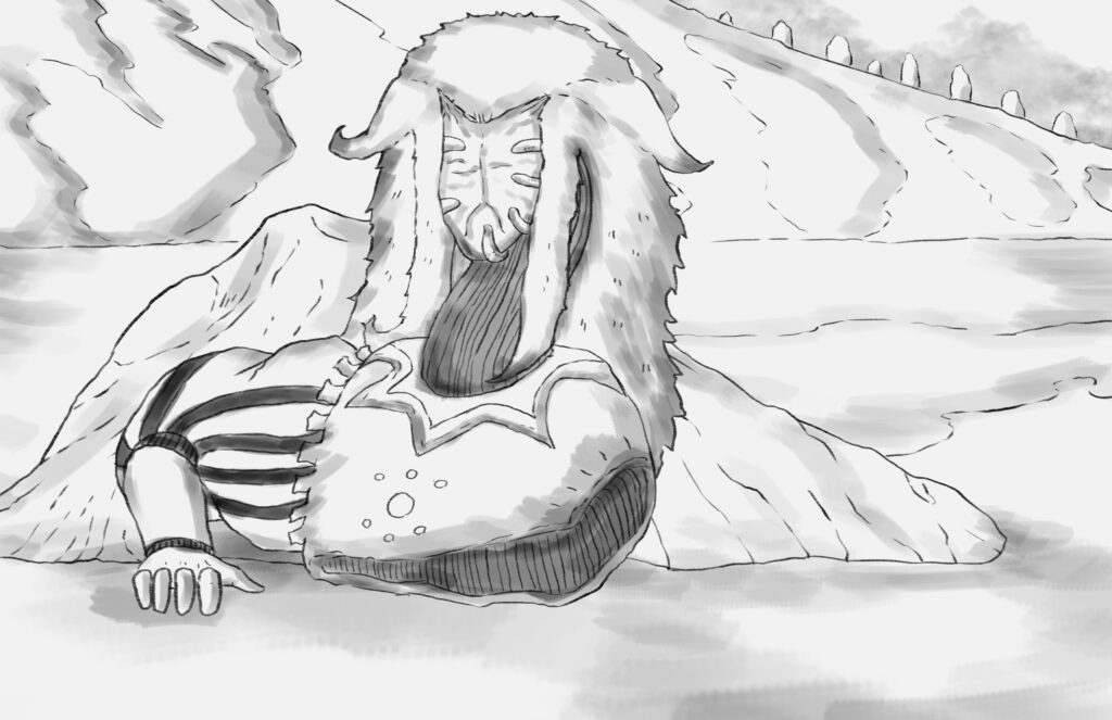 The secondaxehead cleaves Stride’s body in two. The Mountain Monarch gently caresses his shoulder as both halves of Stride’s body fall flat on the ground.